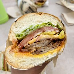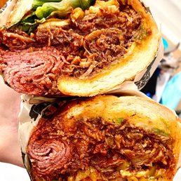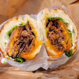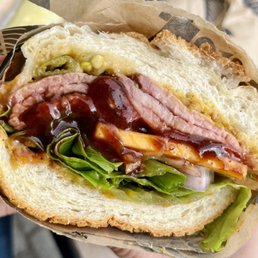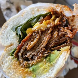 Had this place bookmarked for a while but every time I thought about checking it out on a Sunday, I realized they were closed on Sundays. Well, the day I finally thought about it again, it was a Saturday morning so we were good to go! Ordered our sandwiches at the counter and waited in the outdoor seating area for around half an hour. We bought some beef jerky as a snack/appetizer while we waited. We got the super hero and the triple bypass. The superhero was the perfect balance of tri tip along with the bbq sauce and other ingredients. The triple bypass was little too heavy for me because of all the meat and the pulled pork was a bit sweet for my taste. These sandwiches are loaded though (they don't skimp on the meat) so definitely worth it to me. The dutch crunch for both sandwiches also seemed a bit drier than expected but the contents in the sandwich made up for that. Overall, the sandwiches did not disappoint! I didn't realize you could make online orders until I got there, so l'll be sure to do that next time.